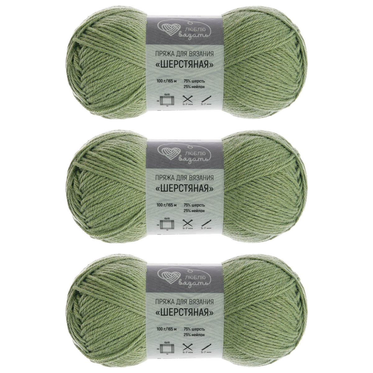 Пряжа Люблю вязать 'Шерстяная' 100гр 165м (75% шерсть, 25% нейлон) (404 зеленый)