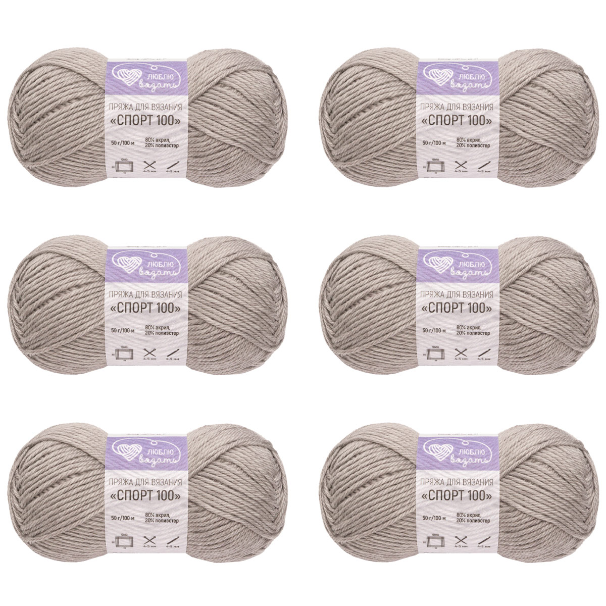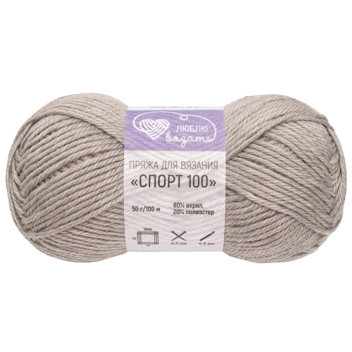 Пряжа Люблю вязать 'Спорт 100' 50гр 100м (80% акрил, 20% полиэстер) (910 cветло-серый)